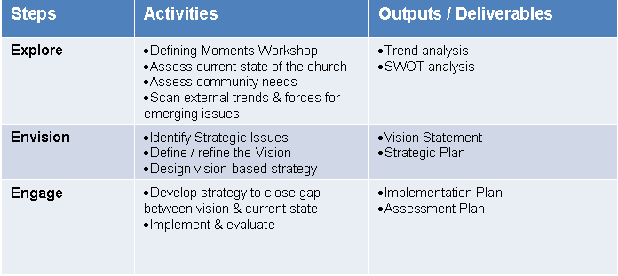Preferable future – once emerging issues are identified and evaluated and church leaders are armed with fresh insight, create or revisit a vision of the preferable future for the church and its community.